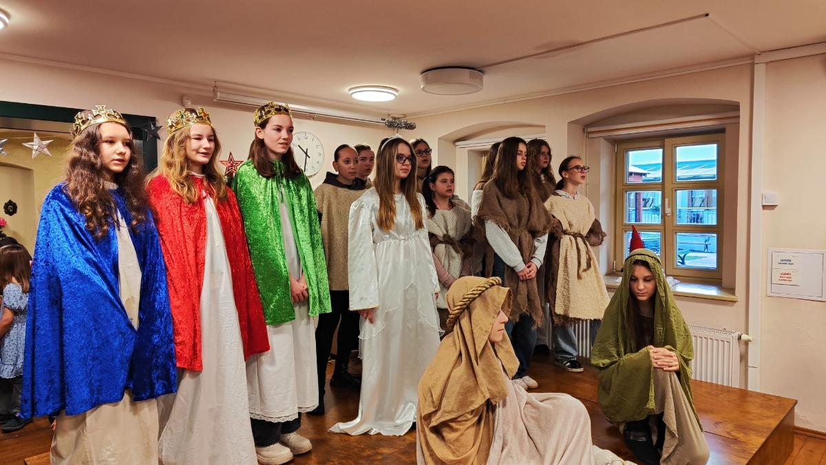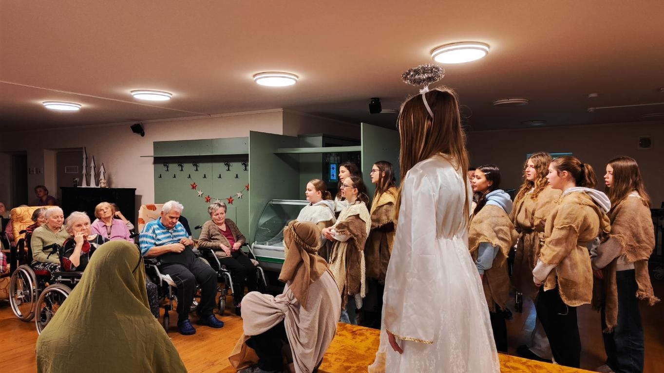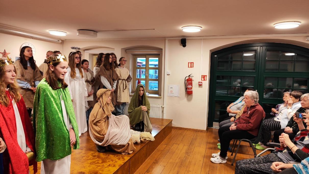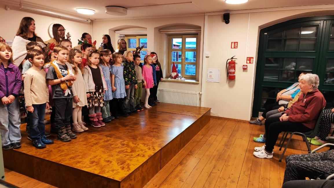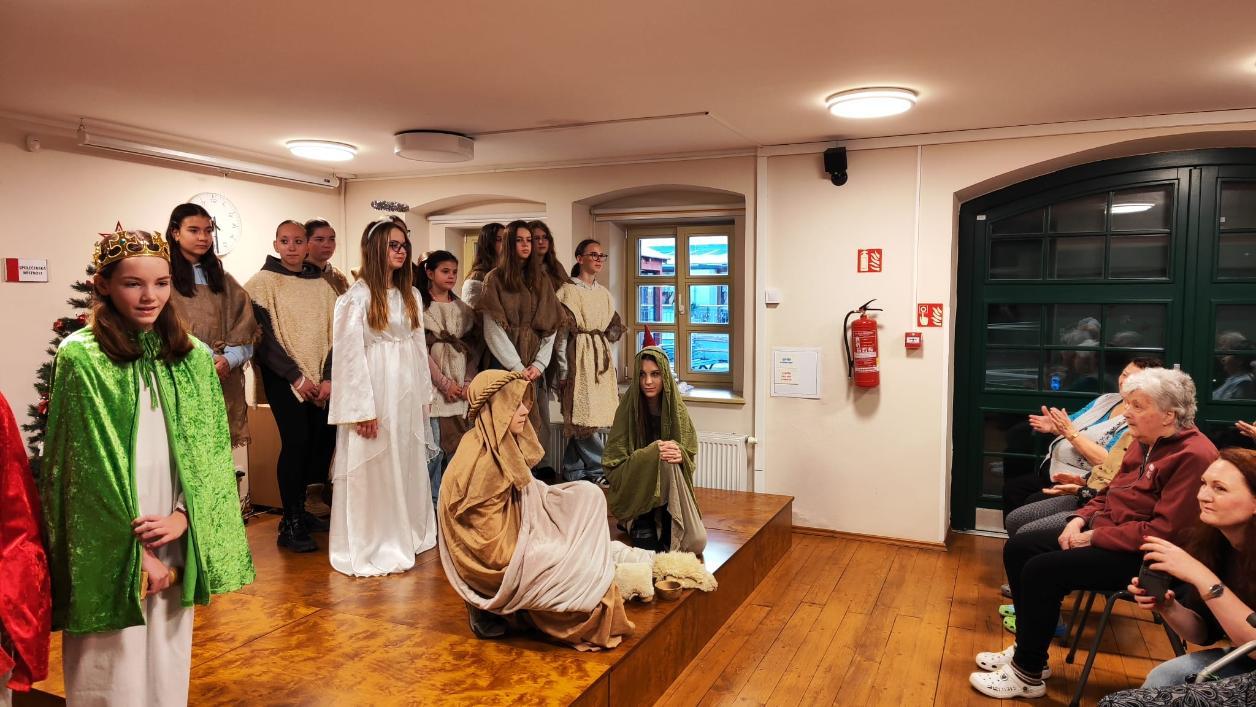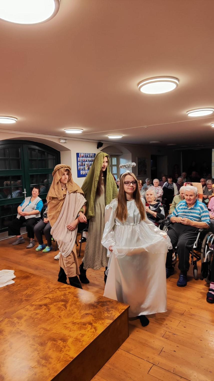 Ve středu 10. prosince naši žáci v rámci akce Dobrý skutek navštívili Domov seniorů v Žatci. Pro místní obyvatele si připravili malé předvánoční vystoupení. Nejdříve se představili naši nejmladší zástupci (žáci 1.A), kteří pod vedením paní učitelek Lenky Duškové a Marcely Holotové zazpívali vánoční koledy a písníčky Ve druhé části pak žáci převážně sedmých a osmých tříd zahráli pásmo Betlém, které nacvičili s pomocí paní učitelky Jroslavy Kumstýřové.