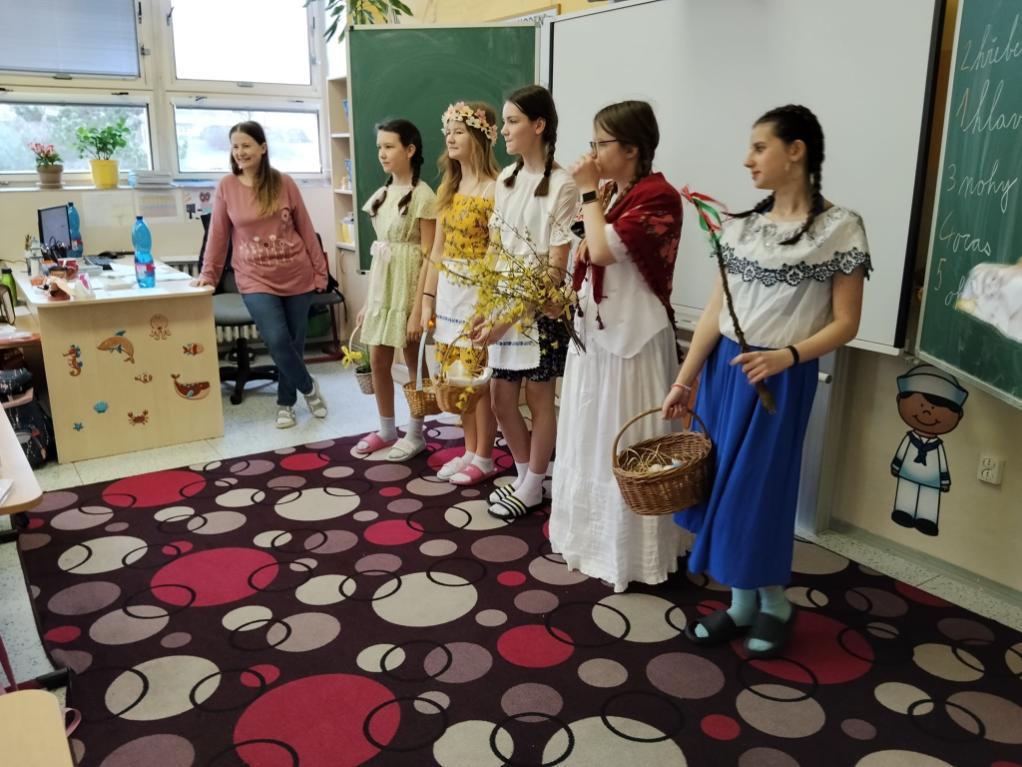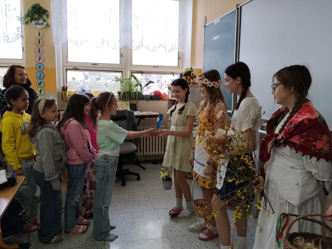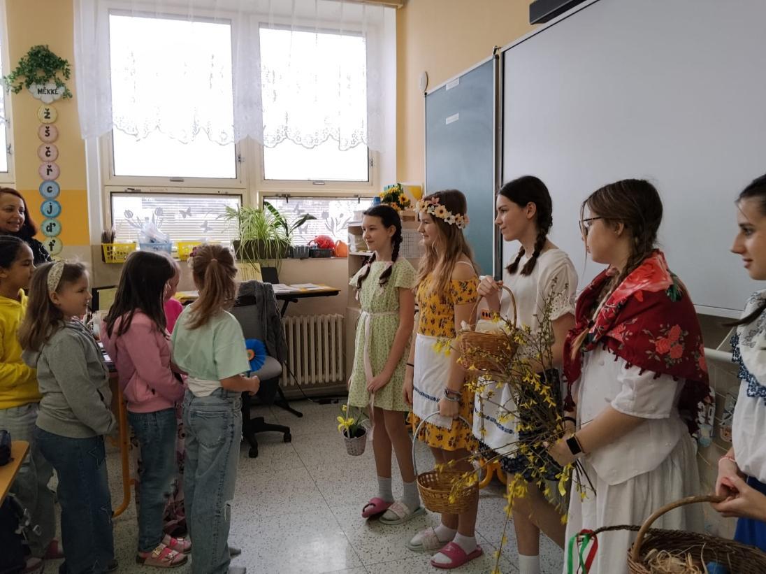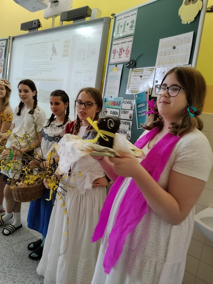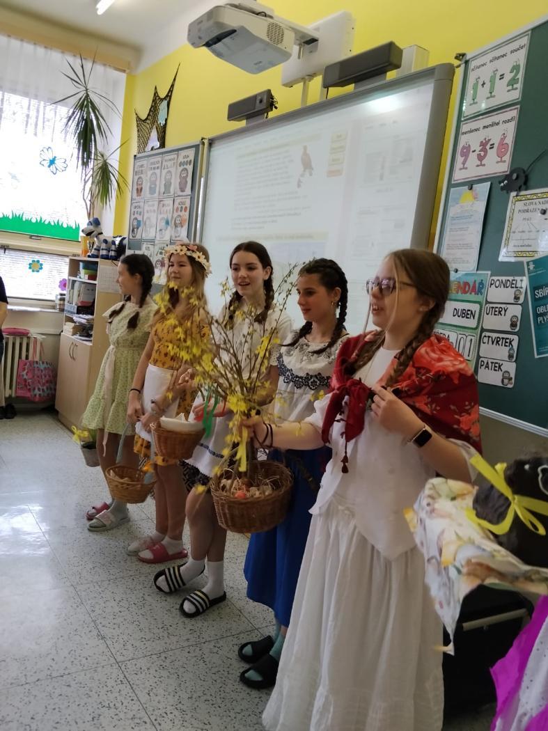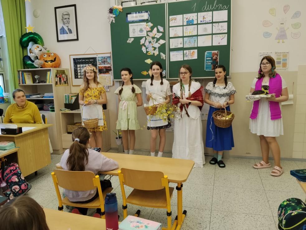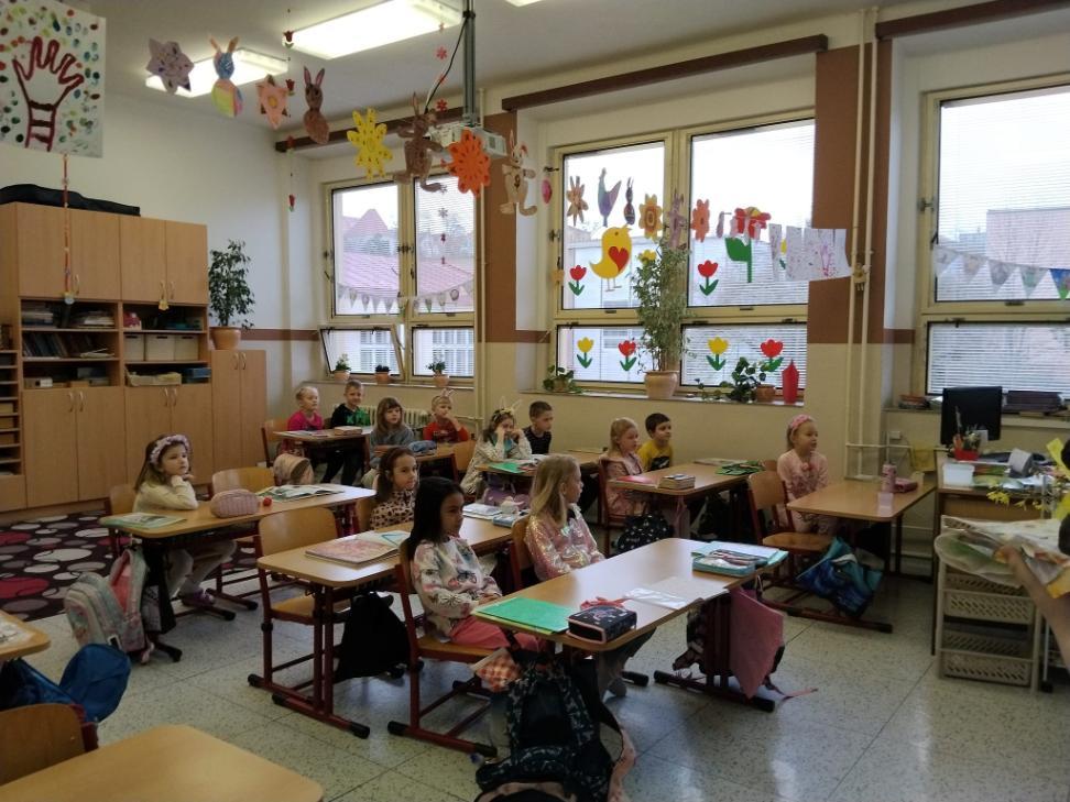 Poslední březnové dny patřily na nší škole přpravám na blížící se Velikonoce. V hodinách pracovních činností, výtvarné výchovy a samostatných velikonočních dílnách žáci vyráběli různé dekorace s velikonoční tématikou. Ty byly použité na výzdobu školy a byly k zakoupení na tradičních Velikonočních trzích v pondělí 30. března. Všechny přípravy pak vyvrcholily ve středu 1. dubna. V tento den jednotlivé třídy 1. supně (a také místní školku) navštěvovala velikonoční družina, která žákům představila zvyky a tradice, které jsou s tímto obdobím spojené.