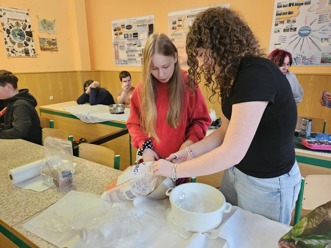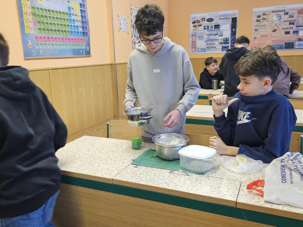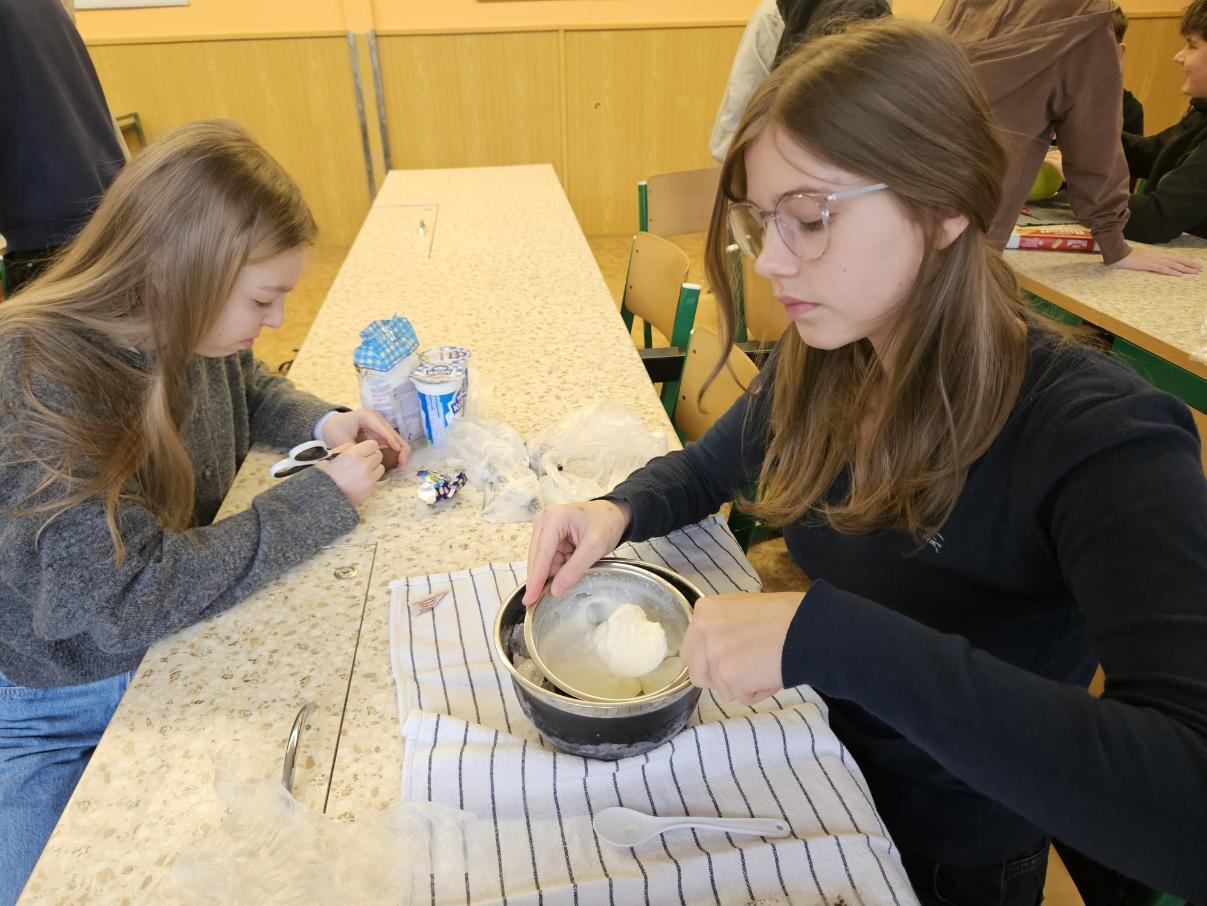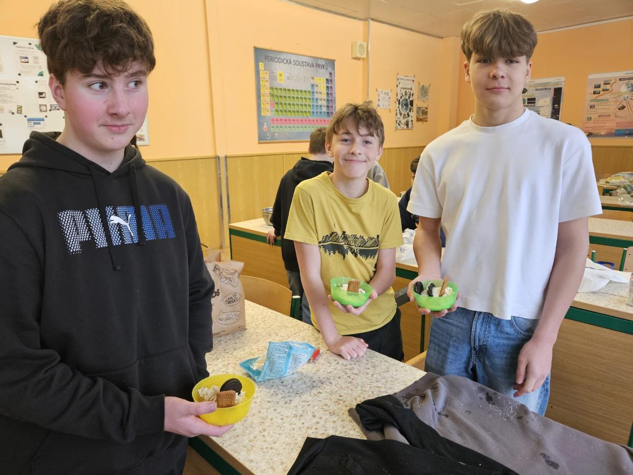 V rámci výuky o tepelných přeměnách si osmáci udělali vlastní zmrzlinu.