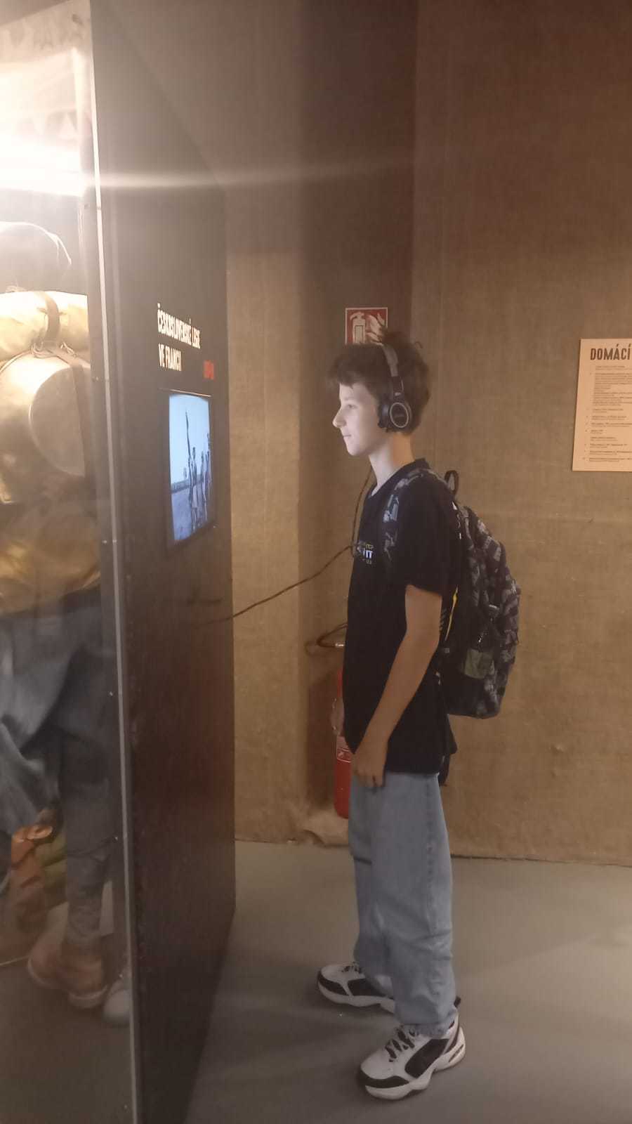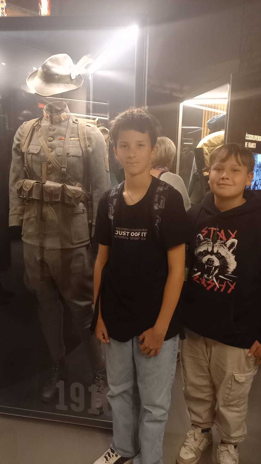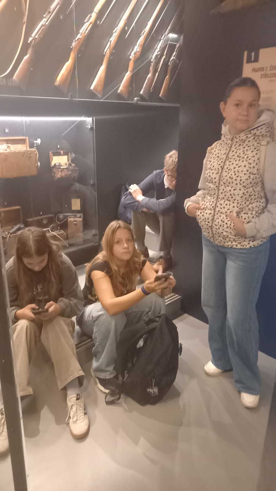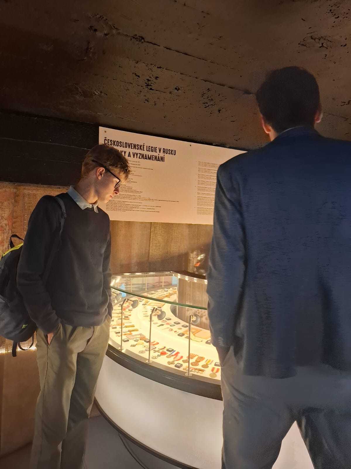 V Praze byla první zastávka a to v Muzeu Československých legií. Při vstupu do muzea nás zaujala interaktivní tabule, kde bylo možné si vyhledat podle místa, kdo byl legionářem v dané lokalitě. Poté jsme se přesunuli do úvodního labyrintu. Po jeho zdech byly umístěny fotky a nápisy, na kterých jsme se seznámili s cestami ruských, francouzských, italských legionářů i srbských dobrovolníků. Po schodech jsme vystoupali do prostoru se sbírkami zákopové techniky, zbraní, granátů, pokrývek hlavy a různých vyznamenání. Bylo zde možné si nasadit helmu a potěžkat si zbraň. Následně jsme sestoupili do haly, ve které byly umístěny prosklené vitríny s dobovými uniformami a výstrojními součástkami. V této části jsme měli výklad o jednotlivých uniformách. Mohli jsme zde shlédnout i tehdy používanou spojařskou techniku.