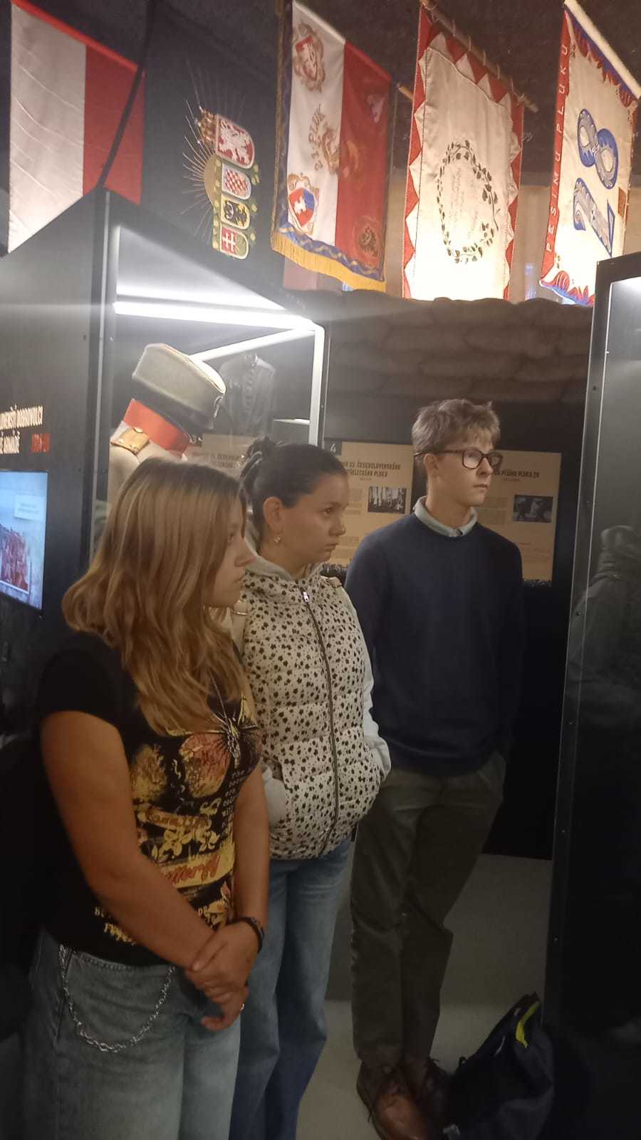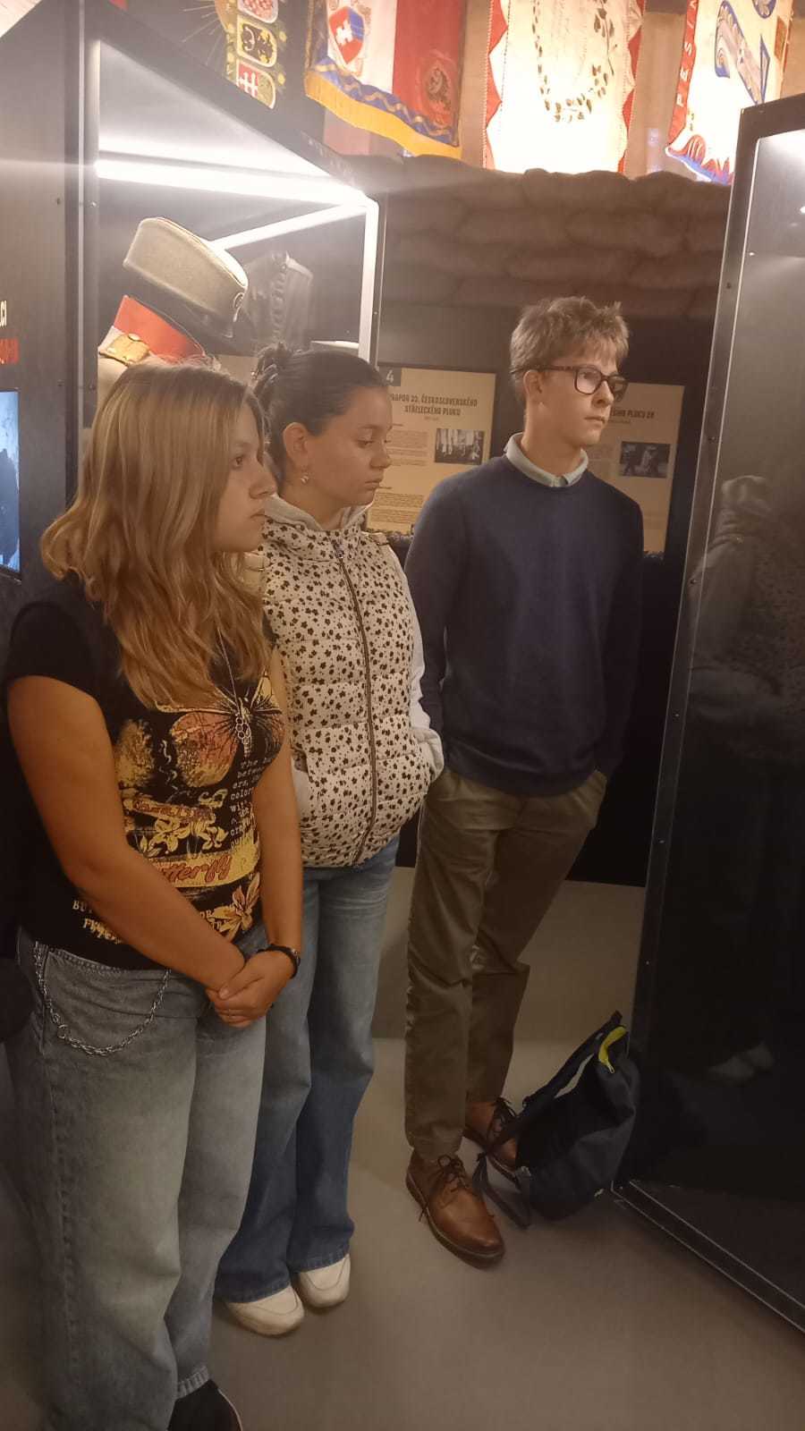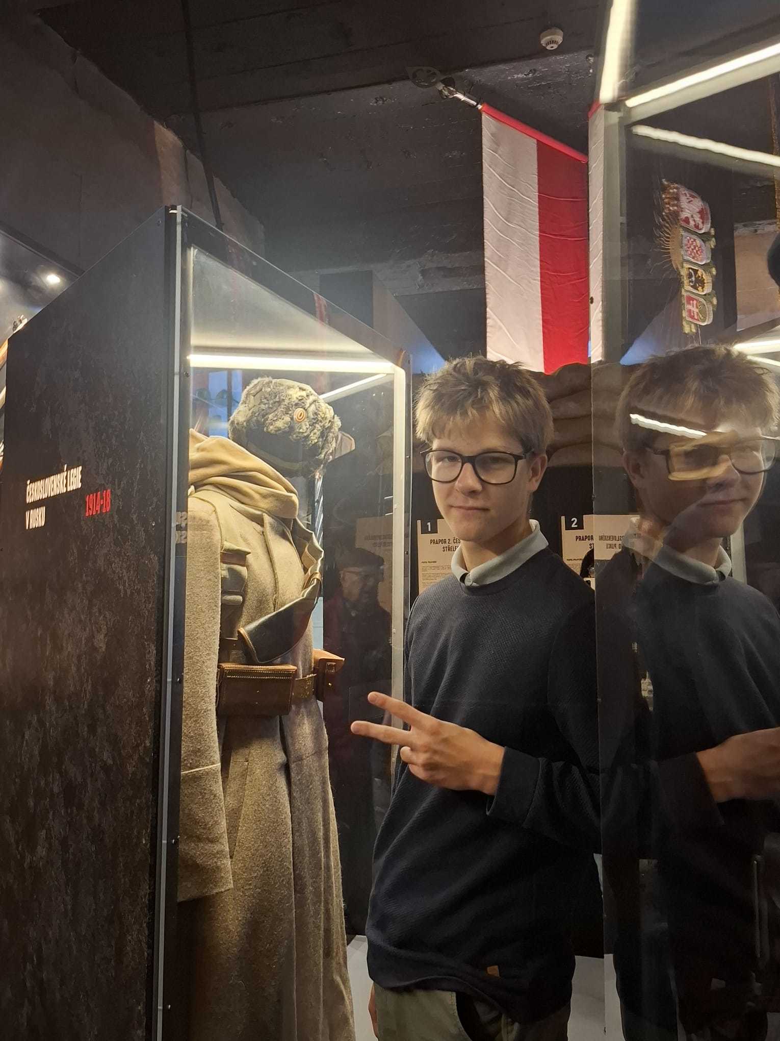 V Praze byla první zastávka a to v Muzeu Československých legií. Při vstupu do muzea nás zaujala interaktivní tabule, kde bylo možné si vyhledat podle místa, kdo byl legionářem v dané lokalitě. Poté jsme se přesunuli do úvodního labyrintu. Po jeho zdech byly umístěny fotky a nápisy, na kterých jsme se seznámili s cestami ruských, francouzských, italských legionářů i srbských dobrovolníků. Po schodech jsme vystoupali do prostoru se sbírkami zákopové techniky, zbraní, granátů, pokrývek hlavy a různých vyznamenání. Bylo zde možné si nasadit helmu a potěžkat si zbraň. Následně jsme sestoupili do haly, ve které byly umístěny prosklené vitríny s dobovými uniformami a výstrojními součástkami. V této části jsme měli výklad o jednotlivých uniformách. Mohli jsme zde shlédnout i tehdy používanou spojařskou techniku.