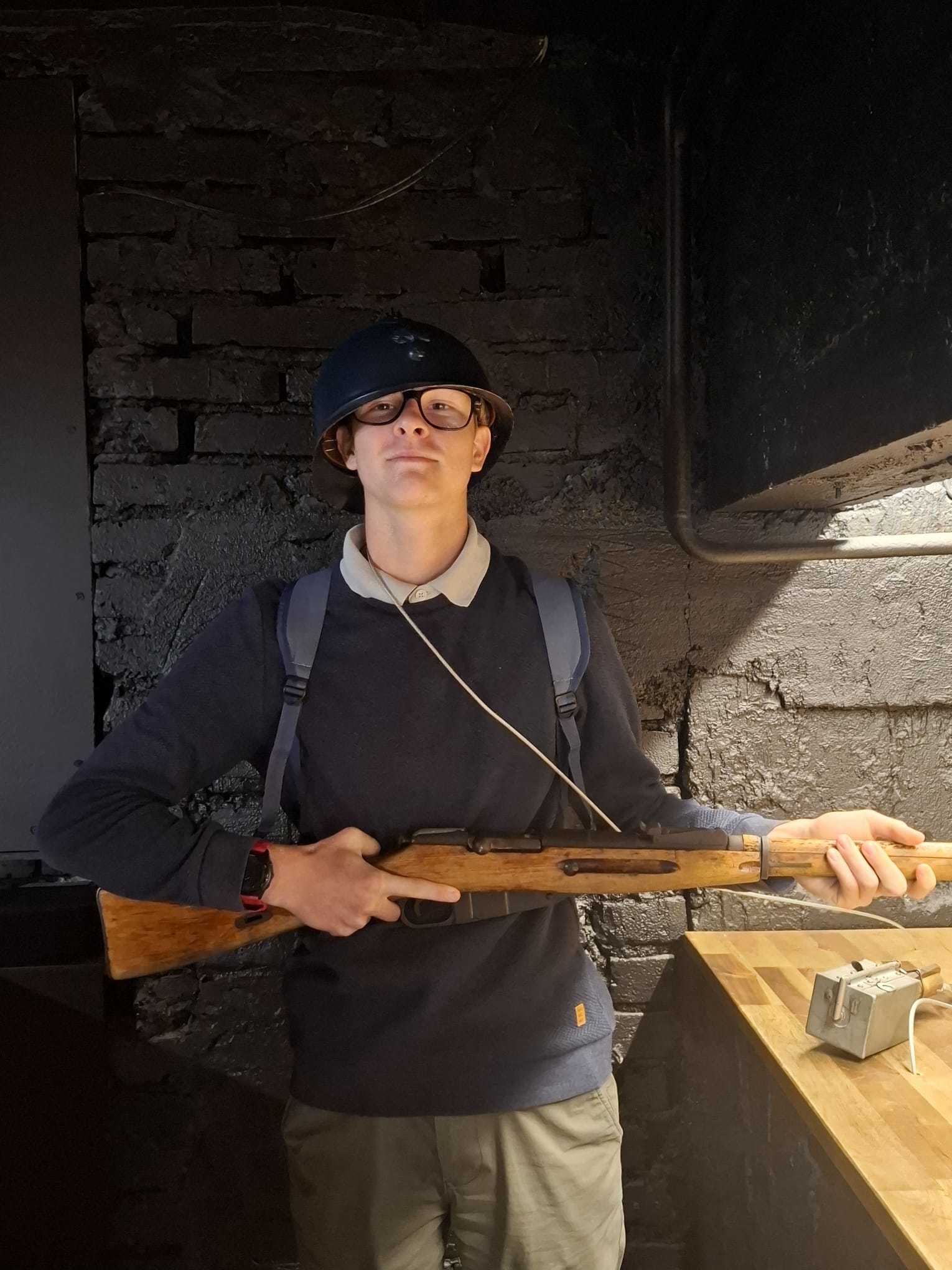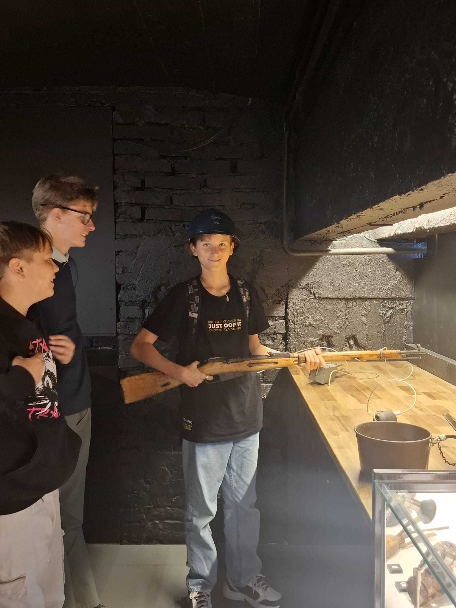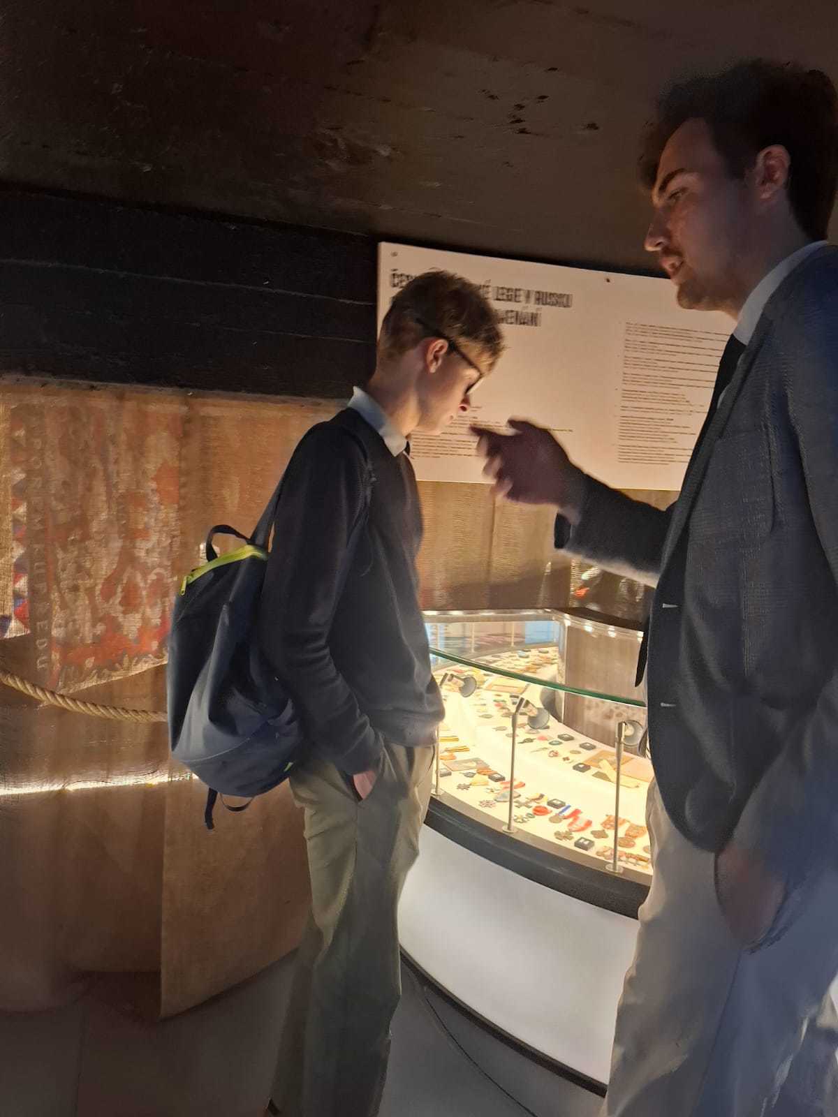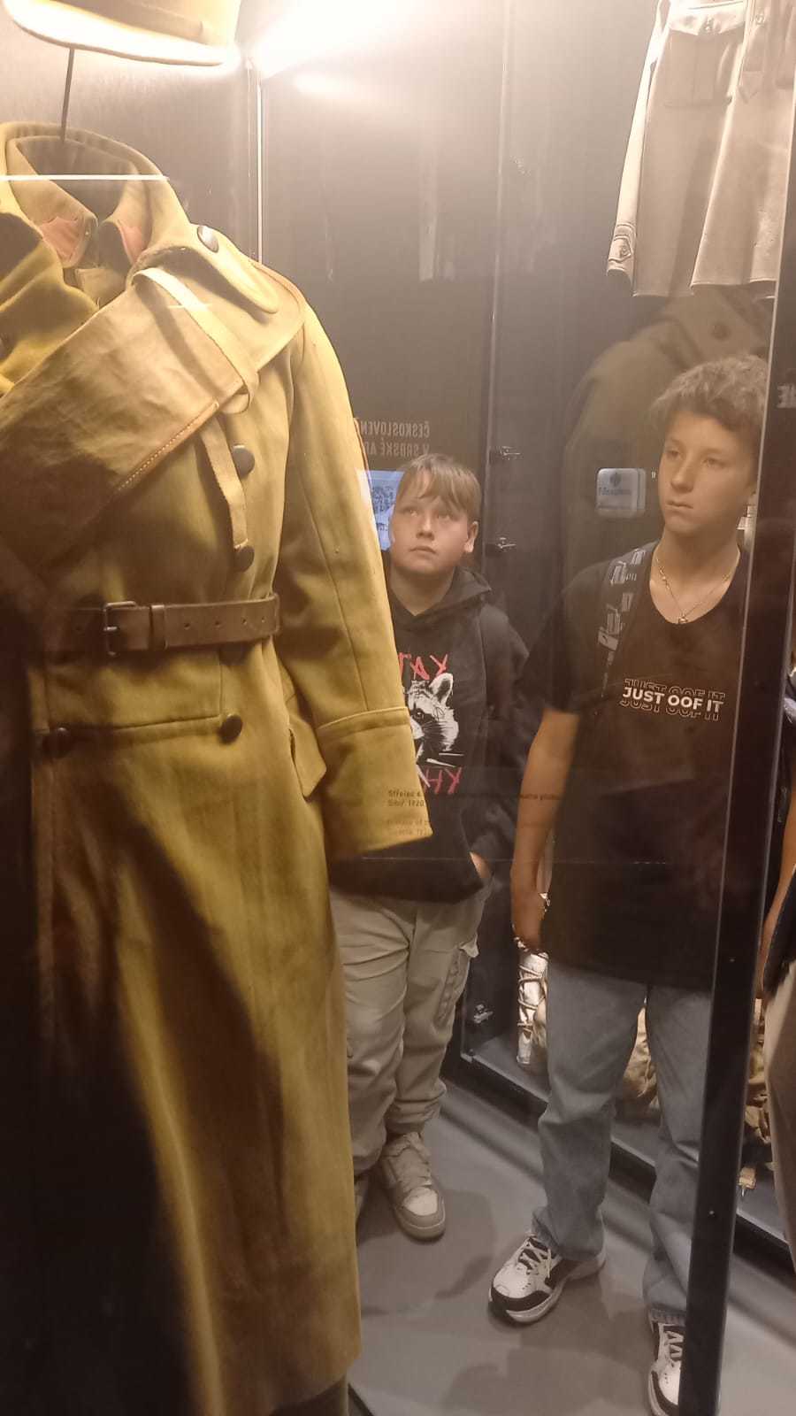 V Praze byla první zastávka a to v Muzeu Československých legií. Při vstupu do muzea nás zaujala interaktivní tabule, kde bylo možné si vyhledat podle místa, kdo byl legionářem v dané lokalitě. Poté jsme se přesunuli do úvodního labyrintu. Po jeho zdech byly umístěny fotky a nápisy, na kterých jsme se seznámili s cestami ruských, francouzských, italských legionářů i srbských dobrovolníků. Po schodech jsme vystoupali do prostoru se sbírkami zákopové techniky, zbraní, granátů, pokrývek hlavy a různých vyznamenání. Bylo zde možné si nasadit helmu a potěžkat si zbraň. Následně jsme sestoupili do haly, ve které byly umístěny prosklené vitríny s dobovými uniformami a výstrojními součástkami. V této části jsme měli výklad o jednotlivých uniformách. Mohli jsme zde shlédnout i tehdy používanou spojařskou techniku.