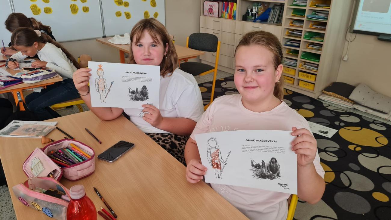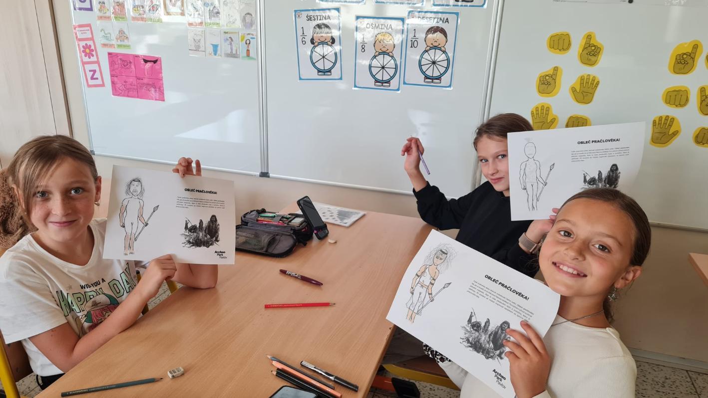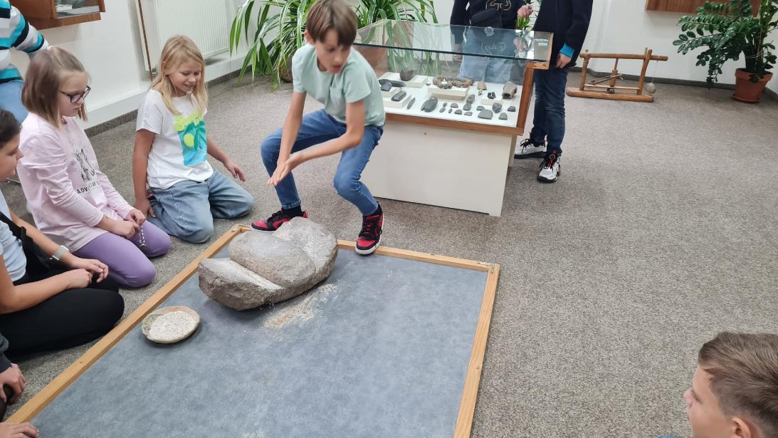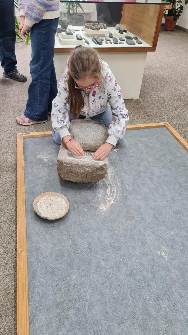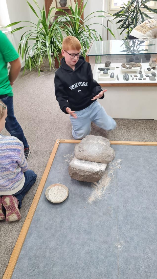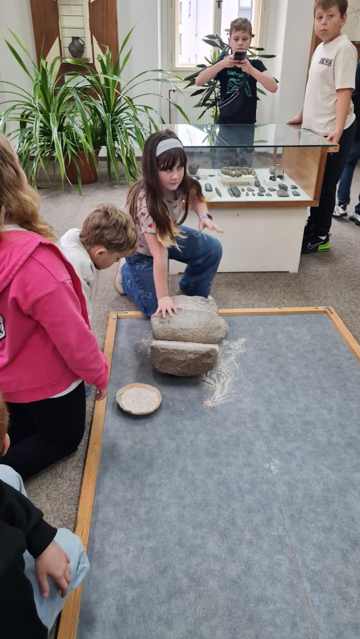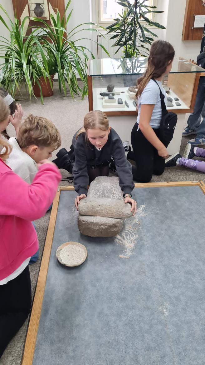 Užili jsme si období pravěku ve všech hodinách - luštění tajenky, matematický kvíz, návrh oblečení pro pračlověka a vše jsme zakončili v muzeu zážitkovou přednáškou. Překvapila nás velikost stoličky od mamuta, dokonale ostrý pazourek a spousta zajímavostí. Ze všech sil jsme se pokusili namlít mouku, ale na koláč to opravdu nestačilo:)