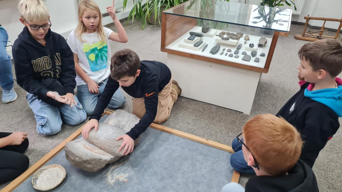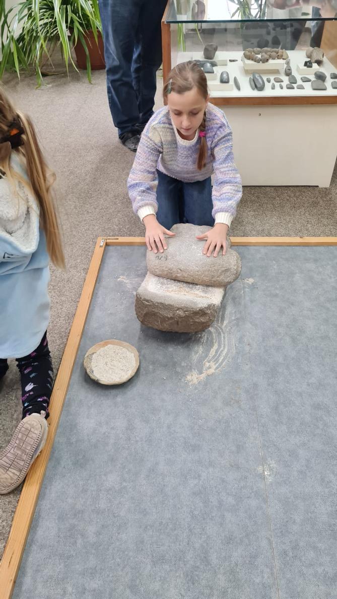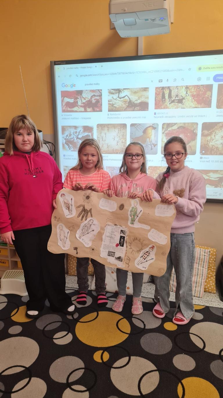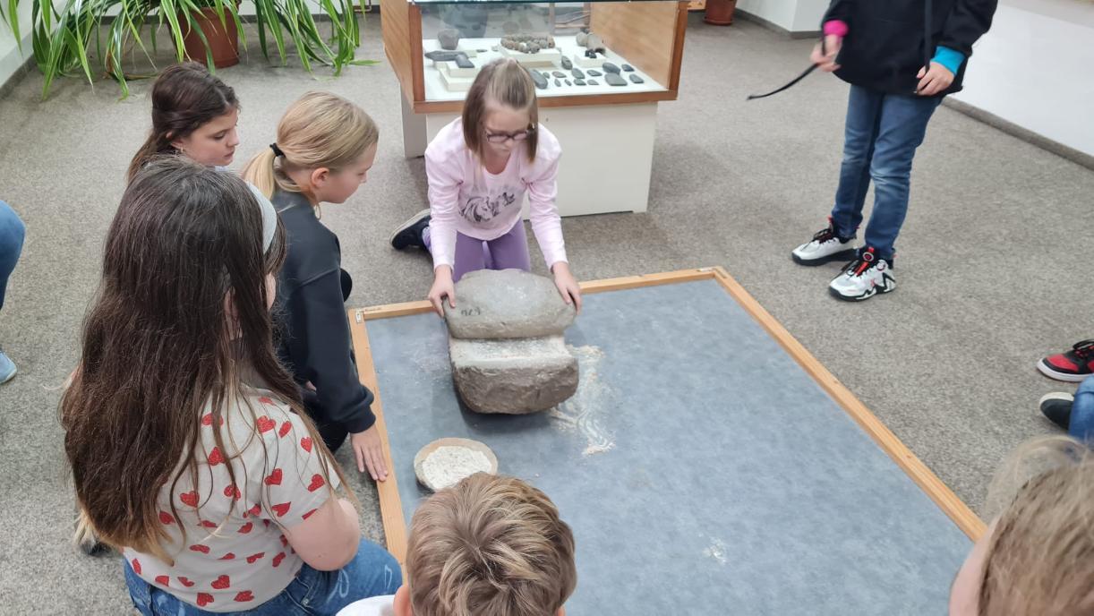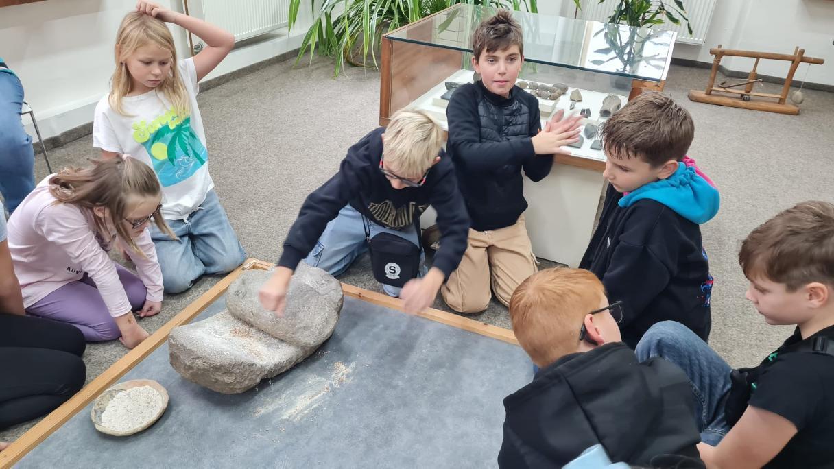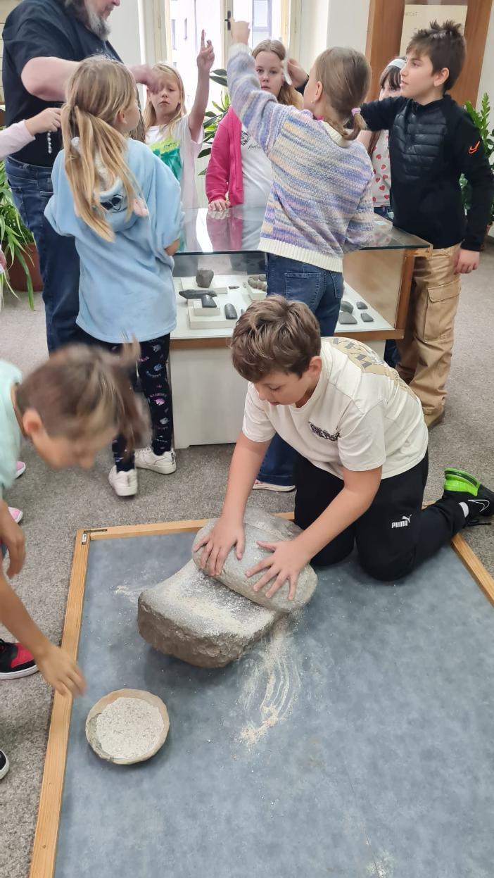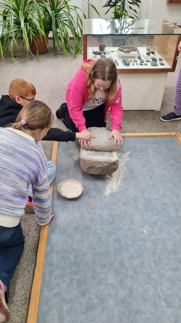 Užili jsme si období pravěku ve všech hodinách - luštění tajenky, matematický kvíz, návrh oblečení pro pračlověka a vše jsme zakončili v muzeu zážitkovou přednáškou. Překvapila nás velikost stoličky od mamuta, dokonale ostrý pazourek a spousta zajímavostí. Ze všech sil jsme se pokusili namlít mouku, ale na koláč to opravdu nestačilo:)