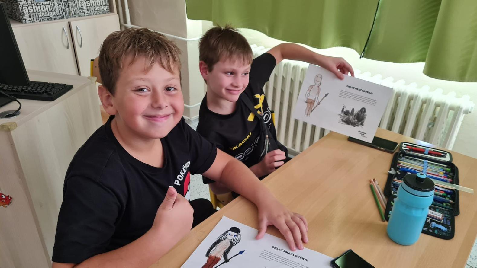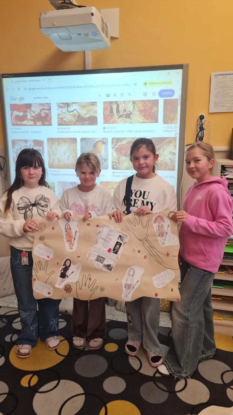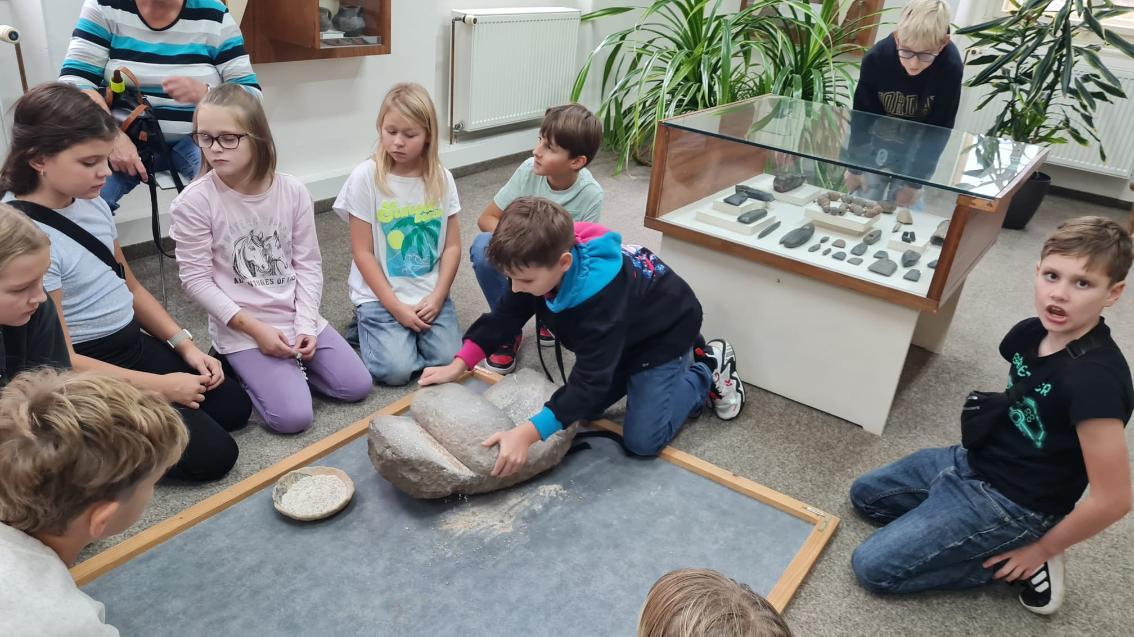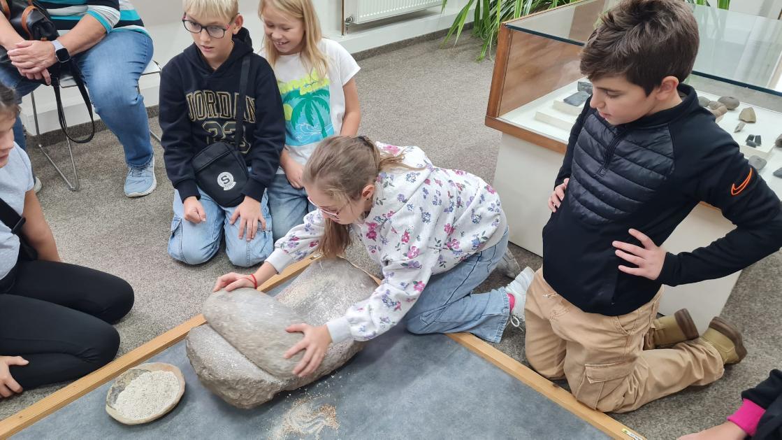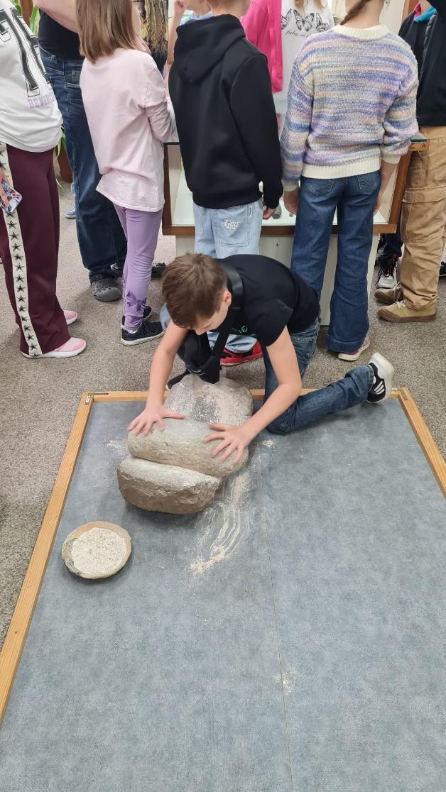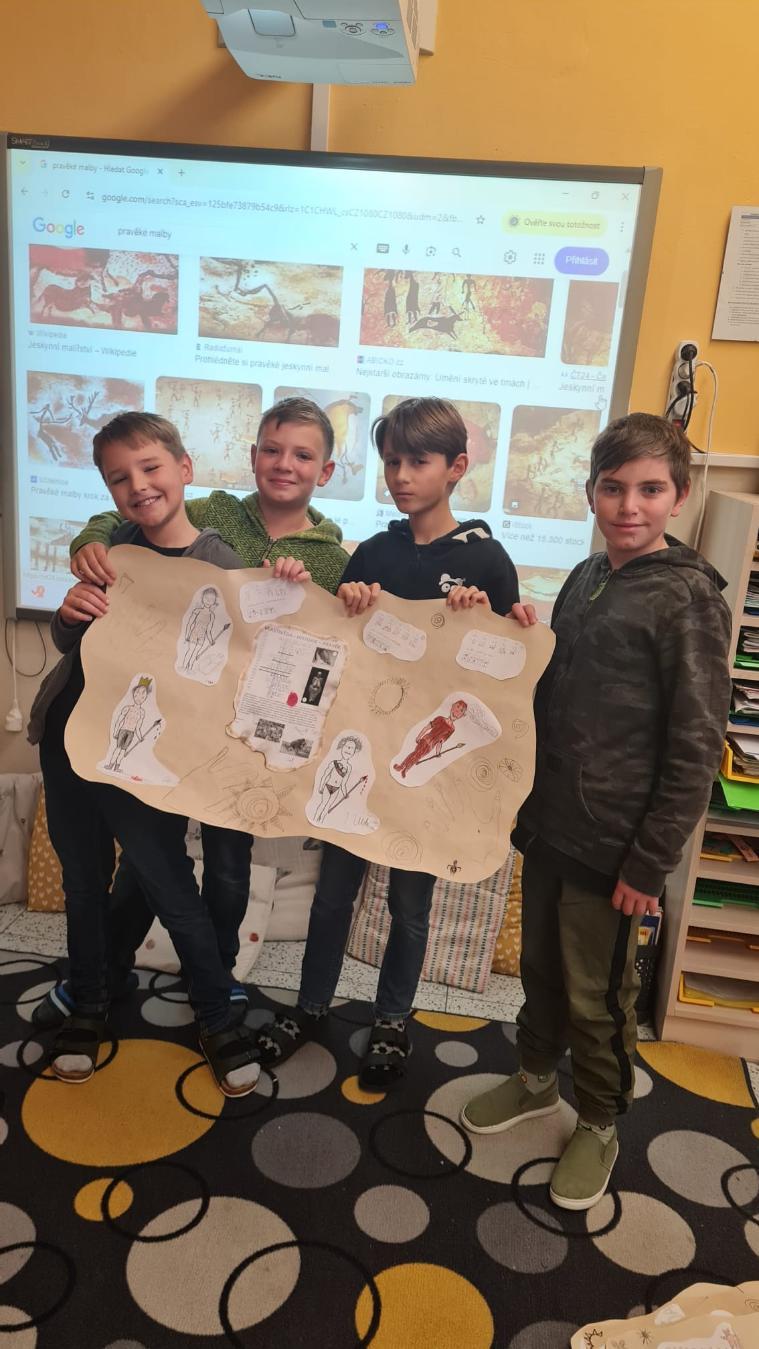 Užili jsme si období pravěku ve všech hodinách - luštění tajenky, matematický kvíz, návrh oblečení pro pračlověka a vše jsme zakončili v muzeu zážitkovou přednáškou. Překvapila nás velikost stoličky od mamuta, dokonale ostrý pazourek a spousta zajímavostí. Ze všech sil jsme se pokusili namlít mouku, ale na koláč to opravdu nestačilo:)