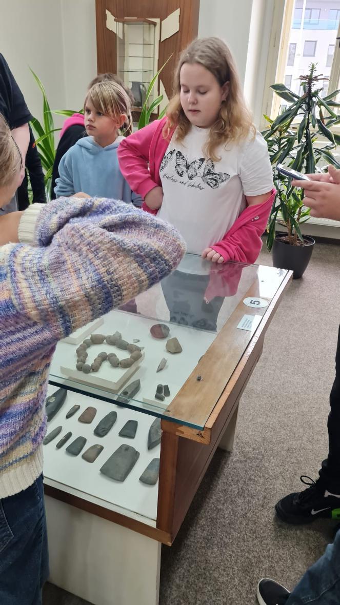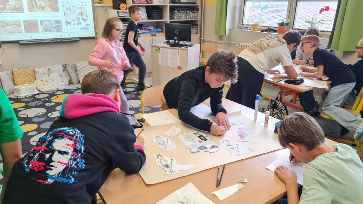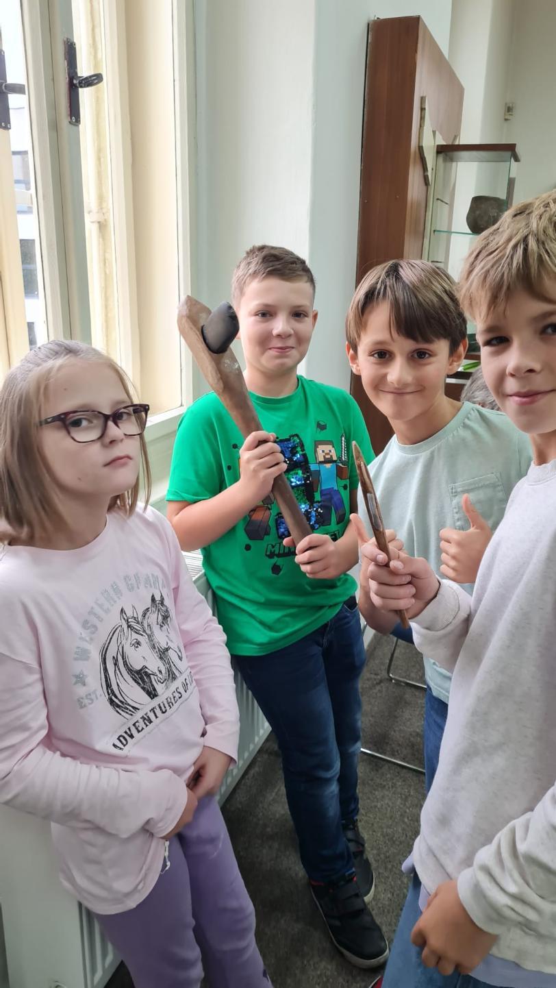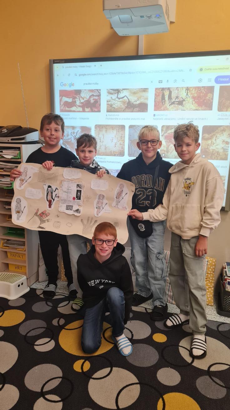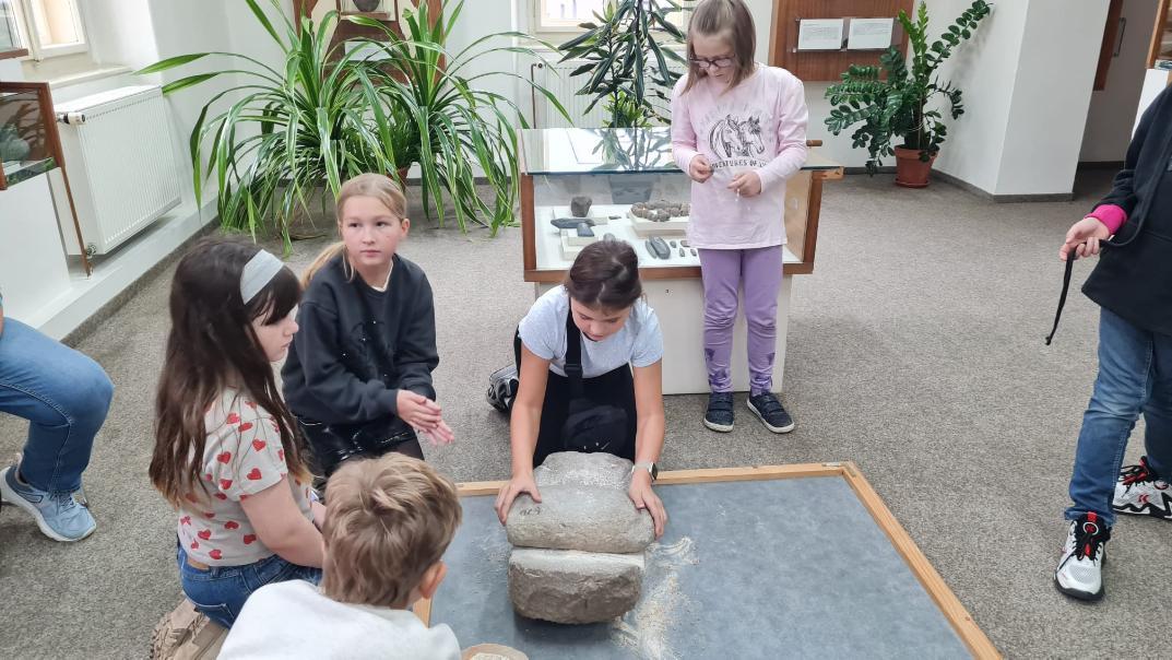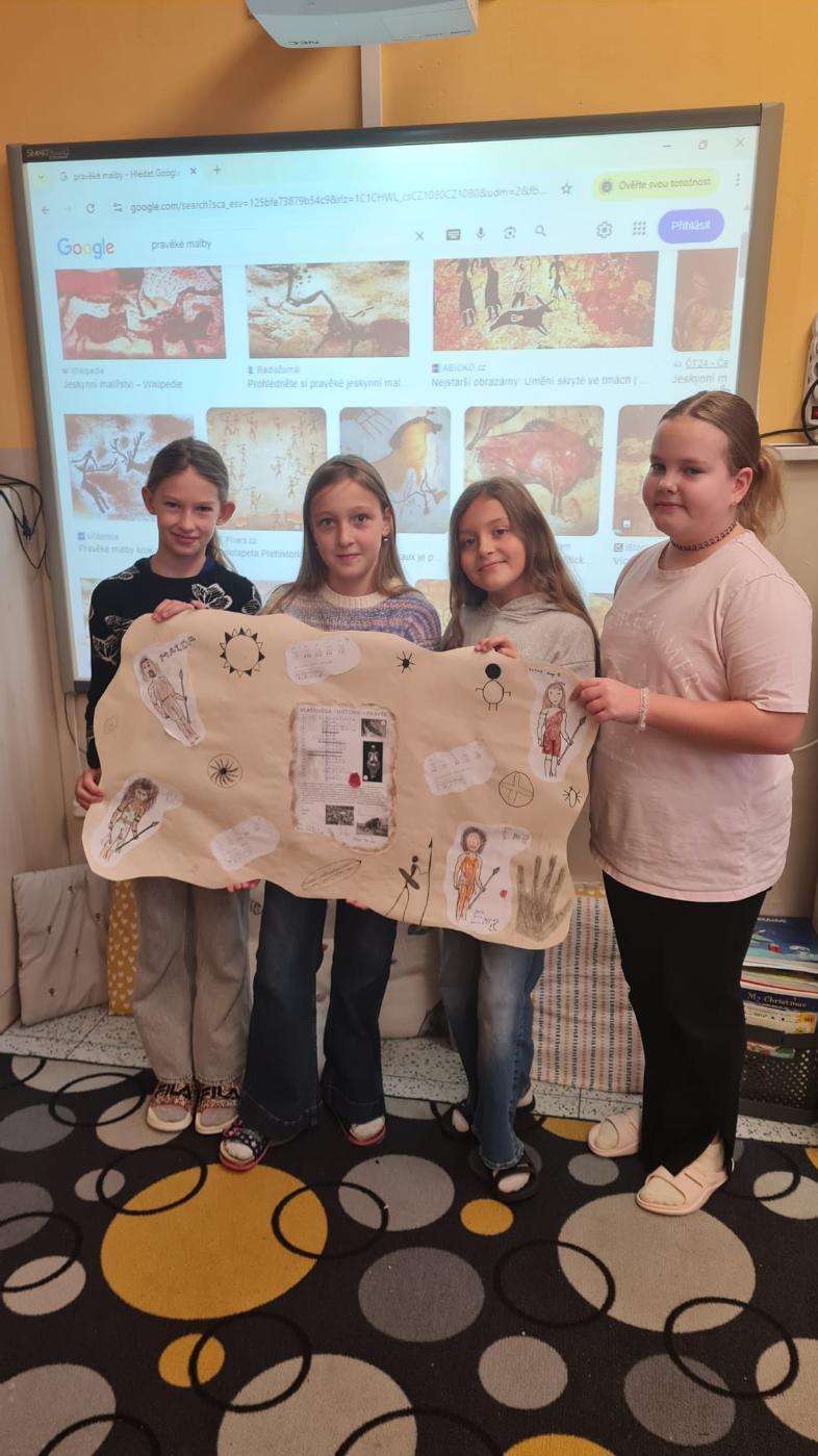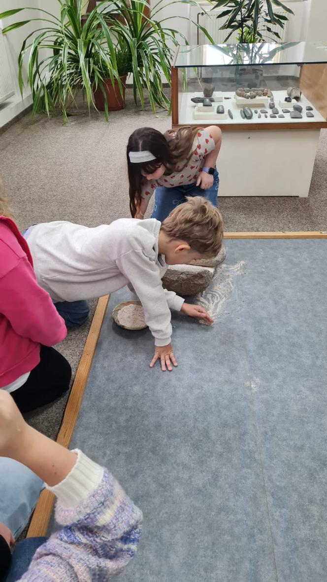 Užili jsme si období pravěku ve všech hodinách - luštění tajenky, matematický kvíz, návrh oblečení pro pračlověka a vše jsme zakončili v muzeu zážitkovou přednáškou. Překvapila nás velikost stoličky od mamuta, dokonale ostrý pazourek a spousta zajímavostí. Ze všech sil jsme se pokusili namlít mouku, ale na koláč to opravdu nestačilo:)