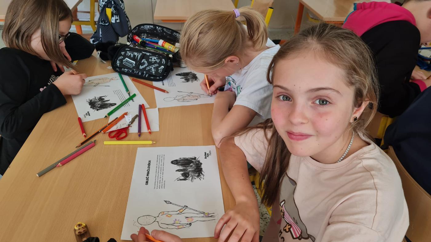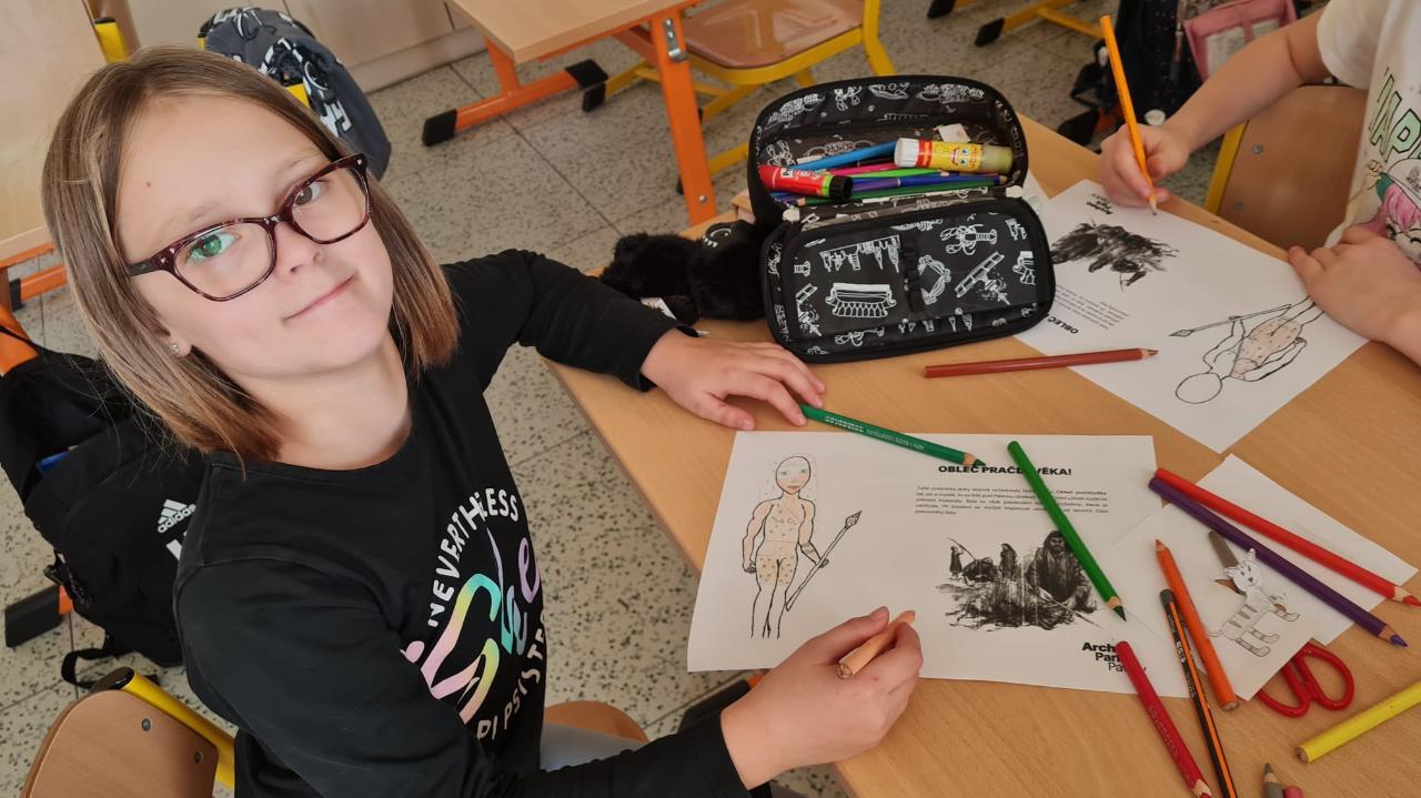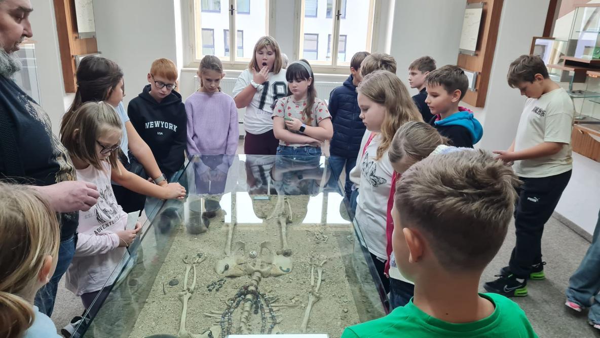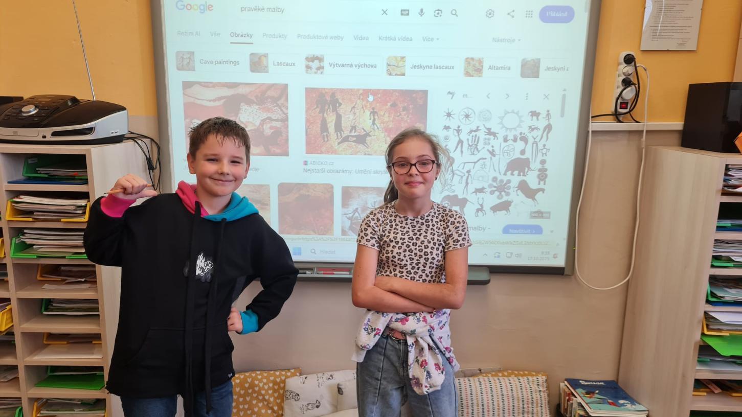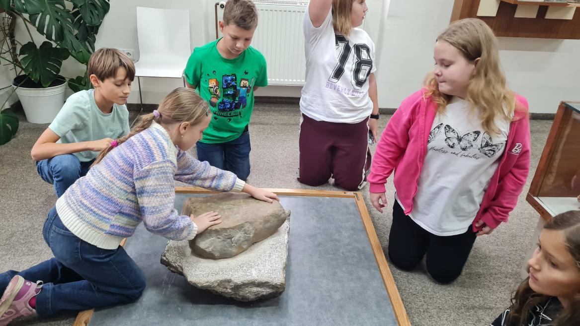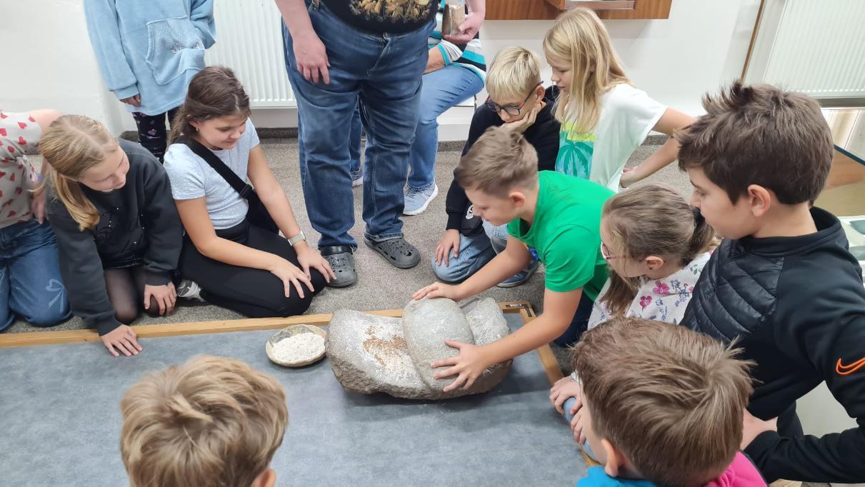 Užili jsme si období pravěku ve všech hodinách - luštění tajenky, matematický kvíz, návrh oblečení pro pračlověka a vše jsme zakončili v muzeu zážitkovou přednáškou. Překvapila nás velikost stoličky od mamuta, dokonale ostrý pazourek a spousta zajímavostí. Ze všech sil jsme se pokusili namlít mouku, ale na koláč to opravdu nestačilo:)