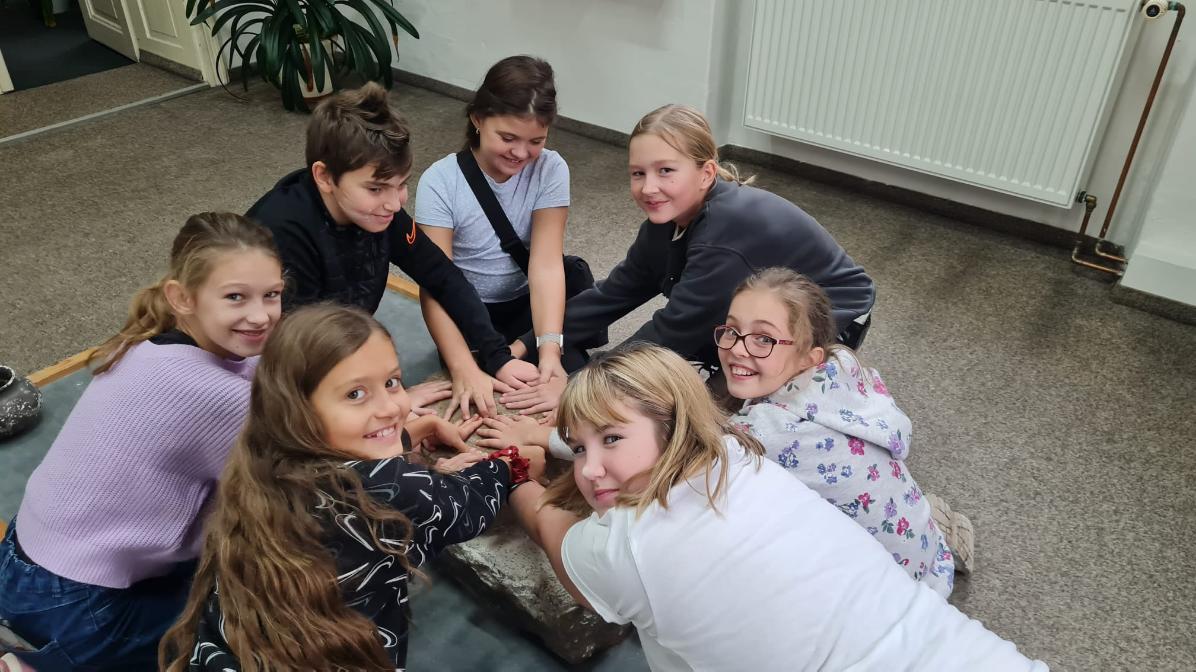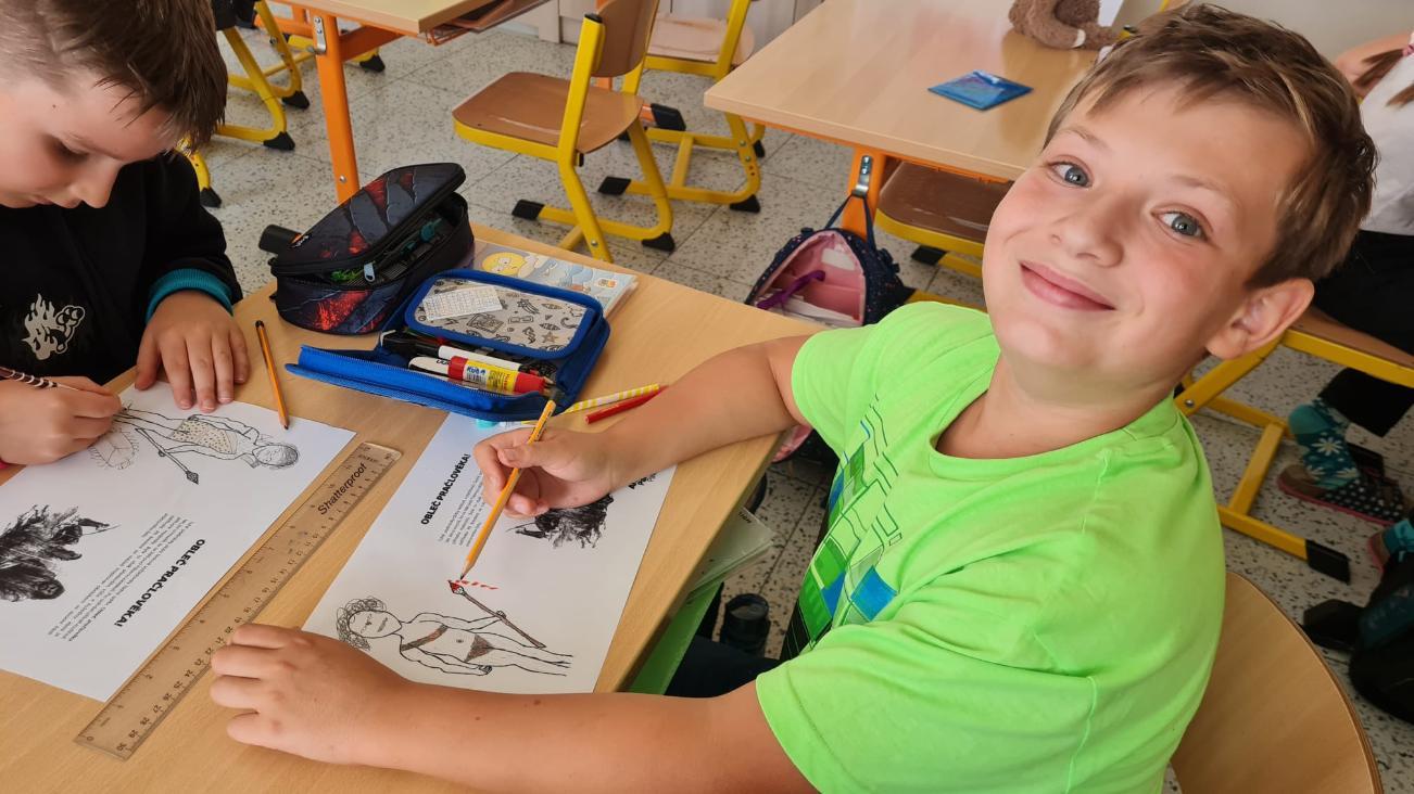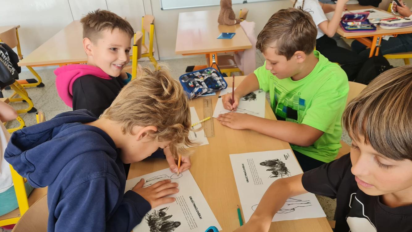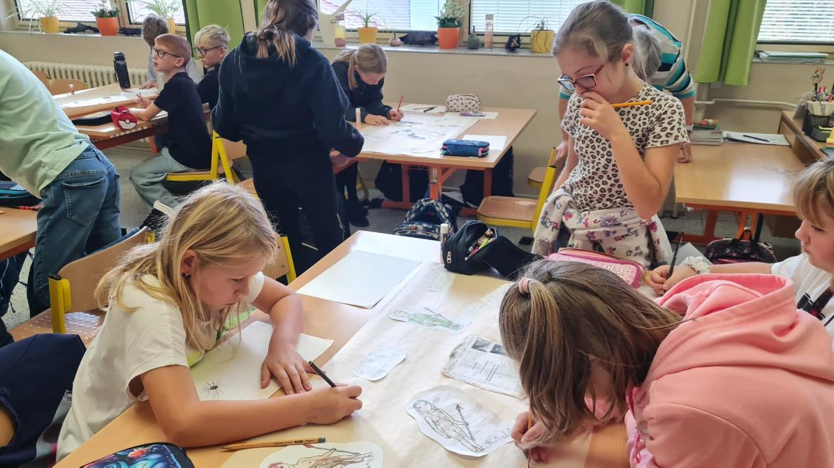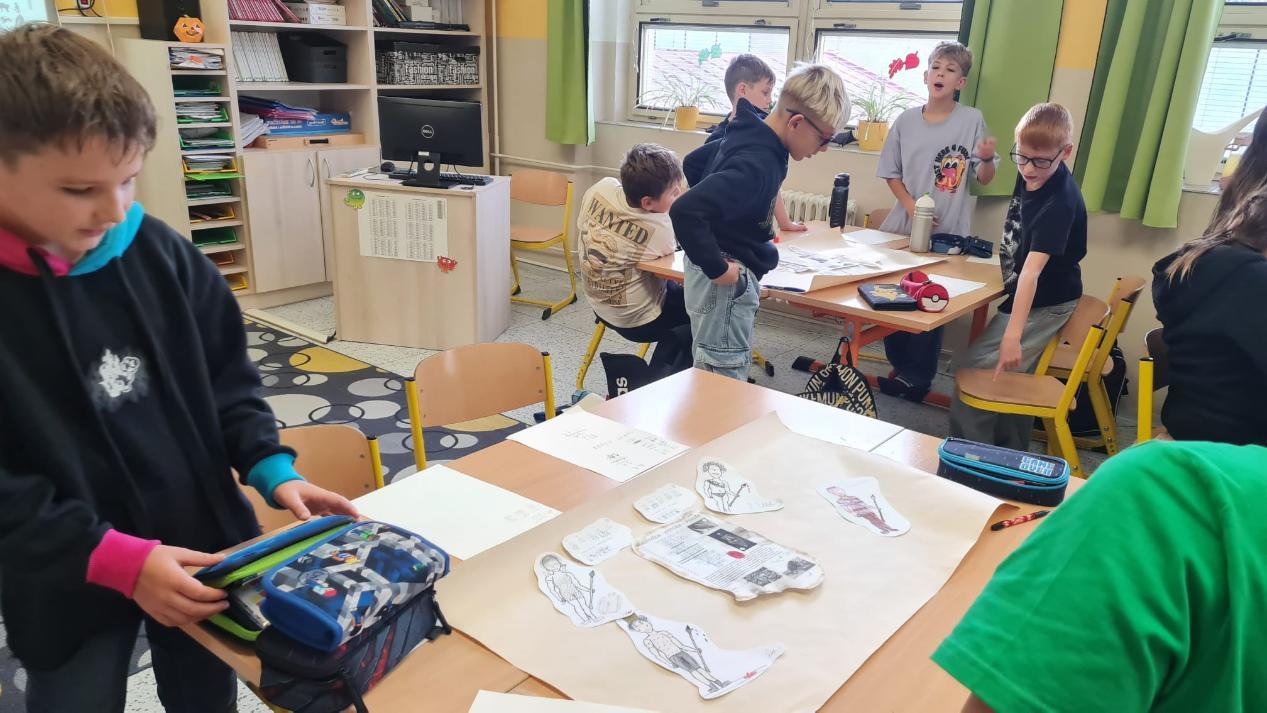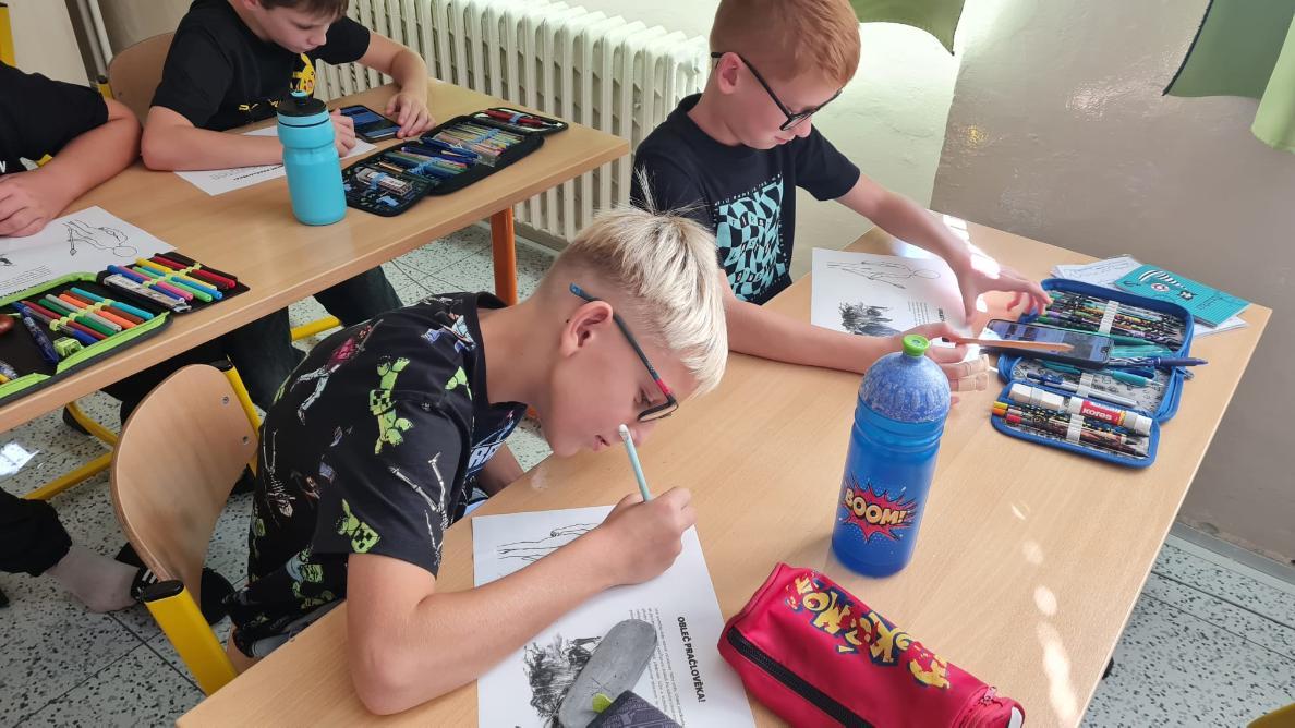 Užili jsme si období pravěku ve všech hodinách - luštění tajenky, matematický kvíz, návrh oblečení pro pračlověka a vše jsme zakončili v muzeu zážitkovou přednáškou. Překvapila nás velikost stoličky od mamuta, dokonale ostrý pazourek a spousta zajímavostí. Ze všech sil jsme se pokusili namlít mouku, ale na koláč to opravdu nestačilo:)